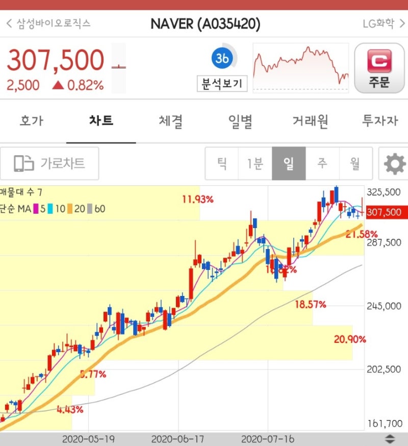 네이버 주가 하락은 21일 실적발표 이후 시작되어 네이버의 주가가 내리막길을 걷는 것은 실적이 가장 큰 원인으로 꼽히고 있습니다. 네이버 NHN 주가 전망. 네이버 주가 차트를 살펴보면 2020년 상승 이후 30만 원 지지선을 굳건히 지켜왔습니다.